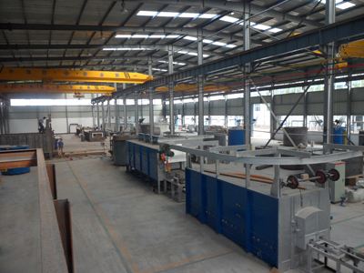 臺(tái)車(chē)式退火爐鋼 結(jié)構(gòu)主要包括爐殼支撐框架和驅(qū)動(dòng)設(shè)備支撐框架(平臺(tái)鋼結(jié)構(gòu))。考慮到爐殼潛在的熱脹冷縮因素,各段爐殼支撐框架與平臺(tái)鋼結(jié)構(gòu)采川相互獨(dú)立結(jié)構(gòu)。各爐段的底 輥室先安裝就位,以自己四角立柱為基準(zhǔn)完成4個(gè)基準(zhǔn)立柱焊接;再焊接左右兩個(gè)整體端板.而操作側(cè)和傳..
